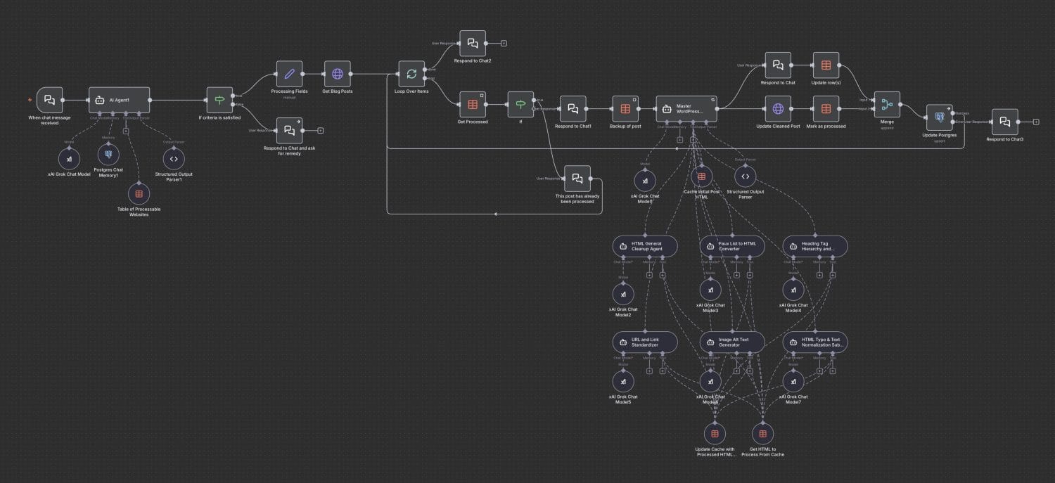 TL;DR — We built an n8n workflow that pulled ~470 posts (15 years of content) from a WordPress site, ran each post through a chain of focused AI sub-agents (HTML cleanup → headings → URL normalization → list fixes → image alt text → typo pass), logged every action to a database, and pushed cleaned HTML back to WordPress. I also built a small JS review app (with Windsurf) to diff original vs AI-edited content so a human can accept/reject changes. Accuracy landed around 85–90% on first pass. Next, I’m gating the “update in WP” step until a human approves. Below is what it took, how it works, and how you can adapt it.