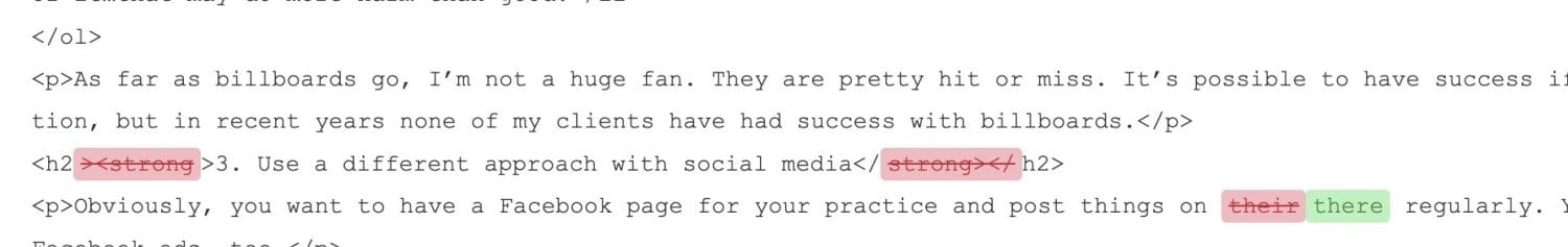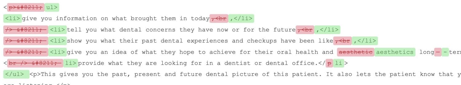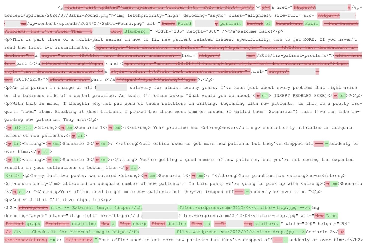 Old posts accumulate junk: inline MSO markup, malformed lists, random <span> wrappers, heading chaos, and hot-linked images. Multiply that by hundreds of posts and you’ve got a slow, fragile site that’s harder to maintain and rank.